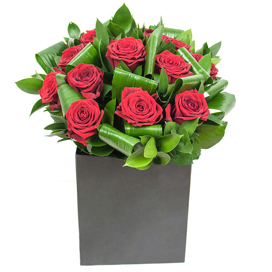 Our radiant red rose ensemble combines vibrant red roses with rich aspidistra leaves and elegant ruscus. This unique design exudes luxury and sophistication, making it an ideal gift for any occasion.